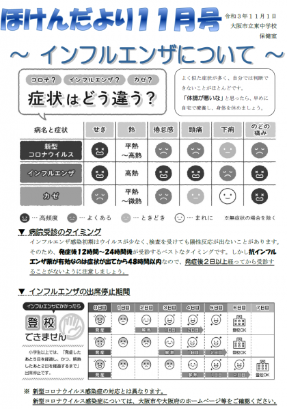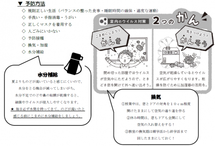 また、この場合の出席停止の期間については、インフルエンザによる出席停止と対応が異なりますので、ご承知ください。昨年度6月4日号「ほけんだより」と今年度11月号「ほけんだより」に症状や予防方法、出席停止等に関する記事を掲載していますので、ご確認ください。