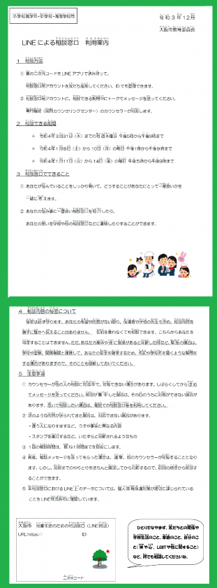 本日より3学期が始まりました。友達や学校、家族のことなどに関して、生徒の皆さんからの悩みや相談を広く受け止めることができる相談窓口についての、大阪市教育委員会からお知らせがありましたので、再々掲します。