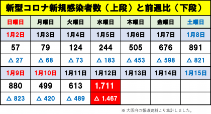 大阪府の新型コロナ新規感染者数が1711人と発表されました。どうか引き続き、感染症対策の徹底をお願いします。