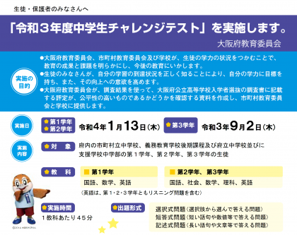「令和3年度中学生チャレンジテストの実施について」のリーフレットは、こちらをクリックすると、ご覧いただくことが出来ます。なお、この調査については、生徒一人ひとりが、自らの学習到達状況を正しく理解することにより、自らの学力に目標を持ち、また、その向上への意欲を高めてほしいとと考えて実施されます。