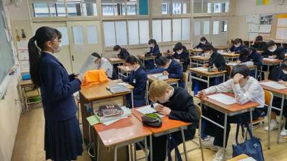 今日の5時間目、2年生は来週19日に開催予定の百人一首大会に向けて、国語係がルール説明などを行ったのち、実際に札を取り合う練習会を行いました。