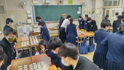 説明が終わった後は練習会に入りました。札の並べ方や試合の手順は昨年末に経験していたこともあり、作業は非常にスムーズで、限られた時間の中だったにも関わらず、ずいぶんたくさんの札をよむことができました。また学年の先生方も、パソコンを使って音声を準備したり、国語科の先生よりも上手なのでは?と思えるくらい本格的によんだりと、積極的に参加して、生徒と一緒にずいぶん盛り上がっていました。