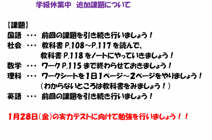 1月28日(金)の実力テストに向けてしっかりと勉強をしてください。