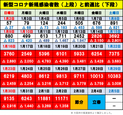 大阪府の新規感染者数が連日1万人を超えています。引き続き、感染症対策と感染拡大防止の取組へのご理解とご協力をお願いします。