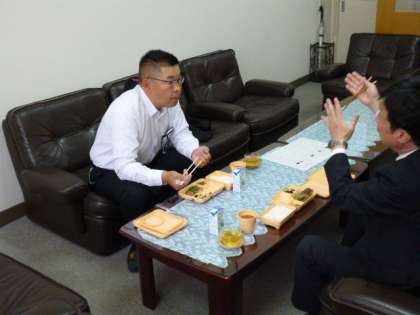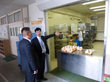 校長室で給食を試食されたのち、本館2階の配膳室や校地西側に隣接している緑地帯を視察され、よりよい環境づくりのためのアドバイスをいただきました。