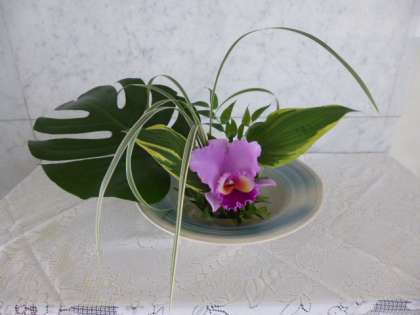 玄関ホールにあるお花は、学校支援ボランティアの中村さんが生けてくださっています。今回は、カトレア・ギボシ・モンステラ・ルスカス・ミソカンサスを使った作品です。