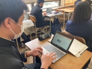 自然環境の保全保護の観点から、大阪市を流れる淀川のワンドについて学びました。その後、SDGsをめざした企業の製品やサービスについて、一人一台端末で調べ学習を行っています。