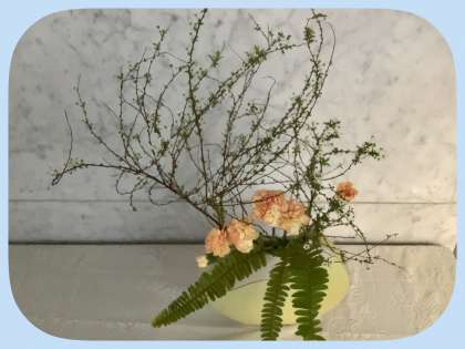 今日は大阪市内でも雪が降りました。今回の玄関の生け花のお題は「雪吹雪」(雪柳・カーネーション・玉しだ)。いつも東中のためにありがとうございます。