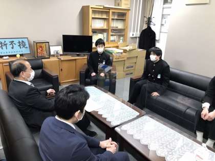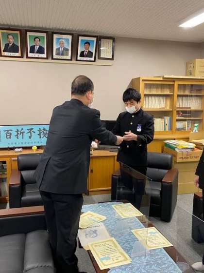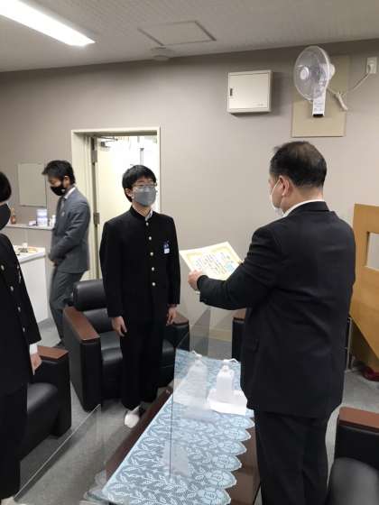 1月22日(土)に行われた全国中学生創造アイデアロボットコンテストの表彰状が届き、本日昼休みに校長室にて伝達表彰式が行われました。試合は1回戦で敗退しましたが、ロボットの評価が高く、審査員特別賞も合わせて受賞しました。