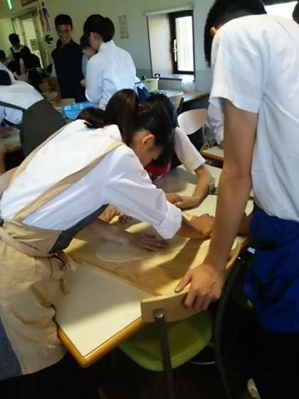 打ち粉をふり、麺棒で薄く大きく広げます。