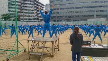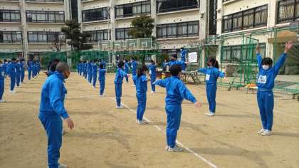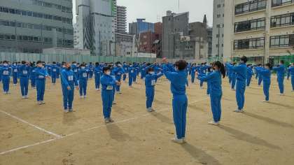 準備体操の様子です。太陽が顔を出し、東中体操をしている生徒を照らし、体操服の東中ブルーが鮮やかに映えています。