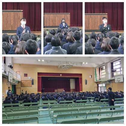 本日は、まだ寒さの残る日となっています。週末は4月下旬の暖かさとなるようです。今週金曜日は、卒業式です。本日から卒業式の練習も始まりました。本日の学年集会では、各クラスの代表からそれぞれの思いを発表していました。