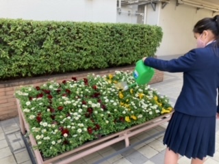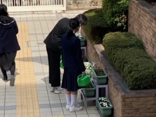 卒業式の片付けに集まりました。花文字の「祝卒」は、次の入学式に向けて、「祝入」に変わっています。