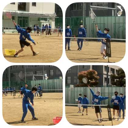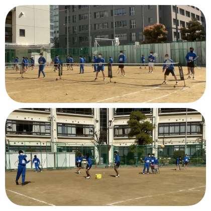 ソフトテニス部が、春の陽ざしをいっぱい浴びて、グランドで活動しています。狭いスペースですが工夫して、感染症対策を施しつつ、安全に配慮して活動しています。