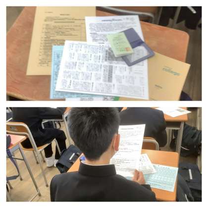 入学式を終えた新入生の教室での様子です。教科書を受け取りました。また、4月8日(金)始業式にご提出いただく書類を配布しています。締切へのご理解とご協力をお願いします。