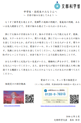 文部科学大臣メッセージ「不安や悩みがあるみなさんへ」(4月7日 再掲します)