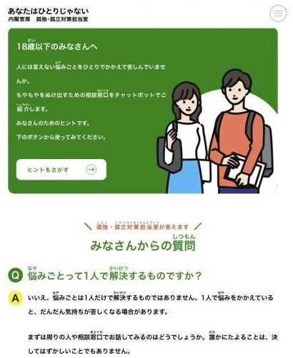 ・【チャットポット】「あなたはひとりじゃない(孤独・孤立対策担当室)」(18歳以下のみなさんへ)はこちら