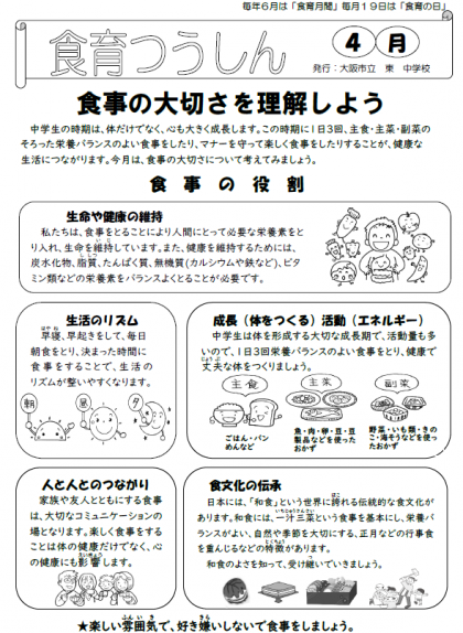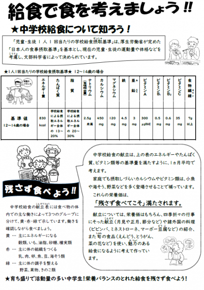 さて、今月の「食育つうしん」では「食事の大切さを理解しよう」の記事が、裏面の「給食で食を考えましょう!!」では「中学校給食について知ろう!」の記事が掲載されています。ご一読ください。