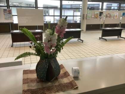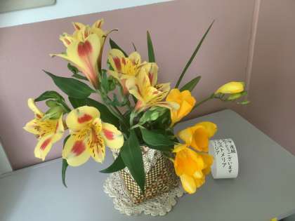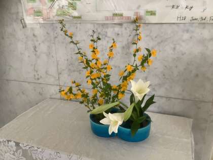玄関ホール・職員室前を彩る生花を生け替えていただきました。ホールの生花は「直なる者へ」と題して「ユリとヤマブキ」、また、「金魚草と玉しだ」(玄関ホール)「アルストメレアとフリージア」(職員室前)も生けられています。いつも東中のためにありがとうございます。