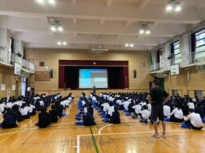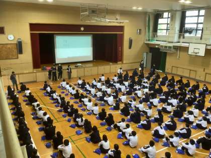 1年生は、新学期初めての水曜日の朝の学年集会を行いました。まず初めに、4月から新しく着任された教育長からのメッセージを見ました。続いて、名札などについての諸注意がありました。