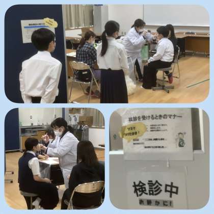 今日から学年別で3日間の眼科検診が始まりました。初日は1年生。新設された1階の多目的室で行いましたが、先生からの指示をよく聞き、とてもスムーズに検診を進めることができました。校医先生からもお褒めの言葉をいただきました。