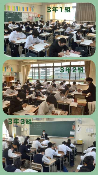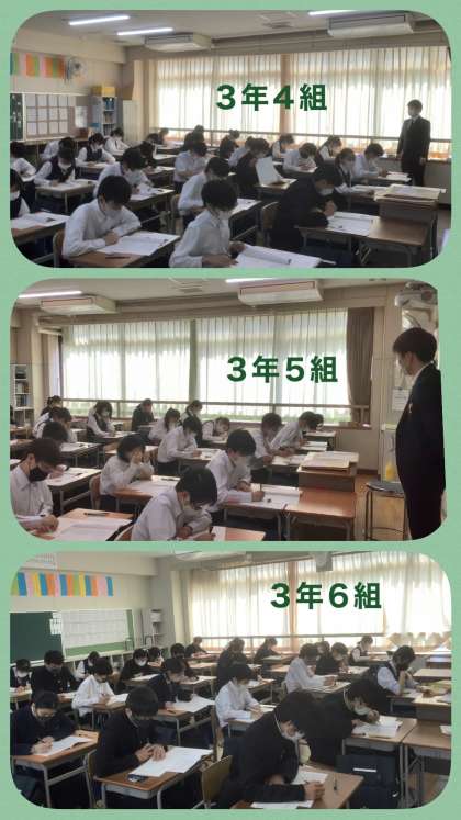 3年生が「全国学力・学習状況調査」に挑んでいます。数学で出題されている問題は選りすぐりの問題が多数含まれています。東中生がこの問題にどこまで立ち向かえるのか、結果がとても楽しみです。3時間目は理科です。