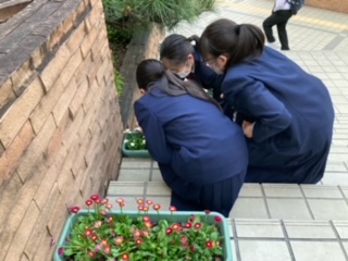 今日は曜日ごとの水まき当番を決めました。先輩に習いながら、火曜日の当番が水まきを行っています。