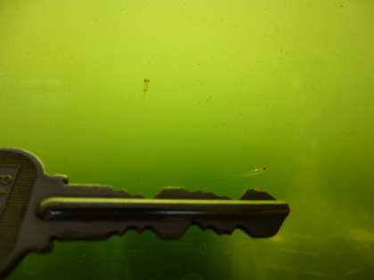 生まれたての頃は、水槽の壁面にへばり付いて動かなかったのですが、今はとっても元気に水槽の中を泳ぎ回っています。鍵と比較してみましたが、体長は1cmぐらいでしょうか?とても可愛らしい大きさです!