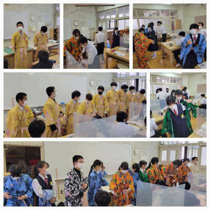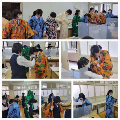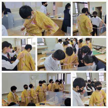 本日の家庭科の授業では、着物を着方を習いました。皆さん、楽しく体験していました。