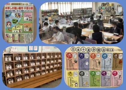 学校元気アップのボランティアの皆さまにもお手伝いいただいての図書室利用オリエンテーション2日目。図書室の本は、日本十進分類法の分類番号順に整理され、書架に整理されています。今日から、本の貸出しができます。東中では、静かに心を落ち着けて読書する時間を大切にして、豊かな心を育んでいきます。