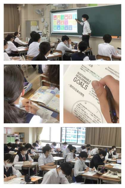 3年生の公民の授業の様子です。「SDGs」を教材に授業が進められ、生徒たちは、先生の説明をしっかり聞いていました。