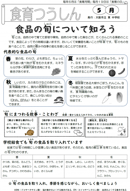 「食育つうしん」では、「食品の旬について知ろう」との記事に、季節ごとの代表的な食品が紹介されています。「旬のものを食べることで、自然の恵みや四季の変化を感じることができます。」季節を感じながら、おいしくいただきましょう。