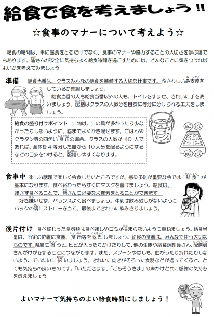裏面の「給食で食を考えましょう!!」では、「☆食事のマナーについて考えよう☆」の中で、給食当番の大切な仕事ついての記事が掲載されています。「黙食」ではありますが、一人ひとりのよりよいマナーで気持ちのよい給食時間にしましょう!
