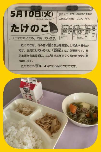 旬の食材「筍(たけのこ)」を使った「ごまかかいため」がメニューに登場しています。移りゆく季節に思いを馳せて、しっかりいただきましょう!
