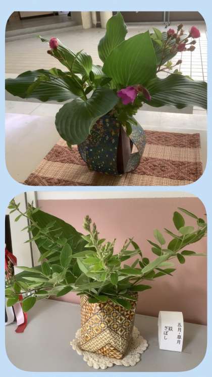 小雨の降る朝を迎えました。大型連休明けのお天気は安定せず、体調を崩しやすい天候が続きます。玄関のお花は「五月雨のとき」のお題で「紅花・ユリ・かすみ草」を活けていただきました。また、ホールのお花は「バラ・ゼラニウム・ぎぼし」、職員室前のお花は「萩・ぎぼし」を活けていただきました。いつも東中生のためにありがとうございます。