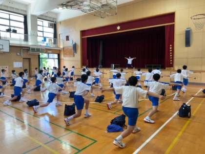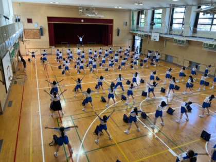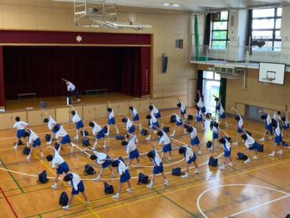 1年生は東中体操の練習に入っています。一つ一つの運動を覚えるだけでなく、指先や腕を上げる高さなど、細かい所までこだわって行っています。