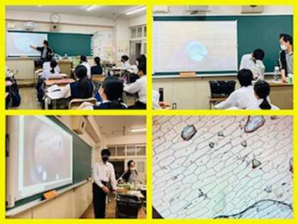クラスの代表が前に出て演示実験を行いました。写画カメラと一人一台端末を使って、実験の様子をみんなとシェアしました。玉ねぎの細胞がくっきり見えました。