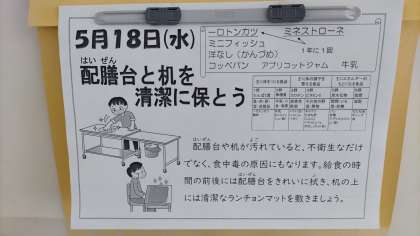 今日のメッセージに「配膳台と机を清潔に保とう」とあります。みなさんはランチョンマットを忘れずに持ってきていますか?食事前には手を洗うように、食べる前には机もきれいに整えて、食べるものを置きたいですね。