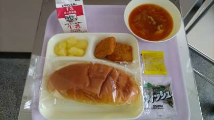 コッペパンはジャムで食べるようになっていますが、今日は試しに半分をカツサンドにして食べてみました。なかなかおいしかったですよ。ミネストローネと並んで一年に一度だけのメニューですが、みなさんはおいしく食べられていますか?