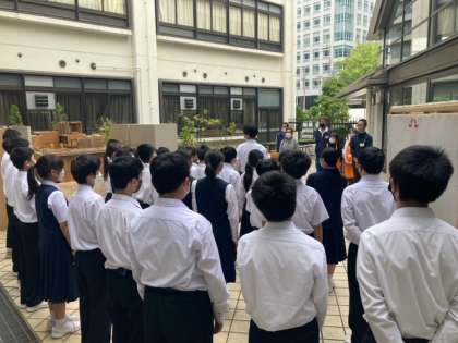 今日は中央区役所と大阪城公園事務局の方々、地域のボランティアの皆さんに東中学校へお越しいただき、春の種花事業の続きを行いました。今年はたくさんの苗ができて、ポット植えが捗りました。
