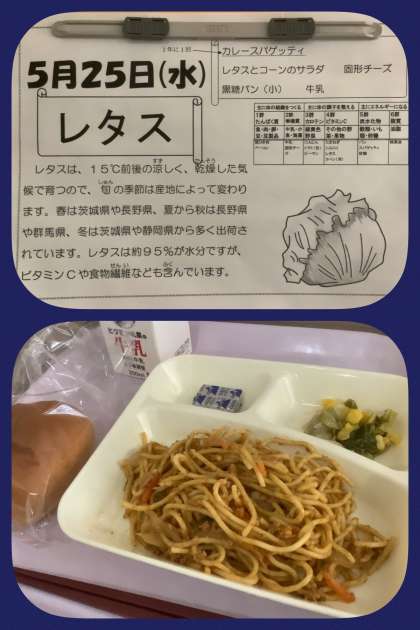 今日のメニューにはカレースパゲッティが登場します。レタスとコーンのサラダも添えて、しっかりいただきましょう!ブラウスやカッターシャツを汚さないように!