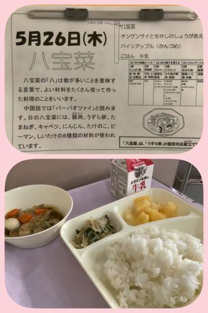 今日のメニューには八宝菜が登場します。1年に1度の献立です。チンゲンサイともやしのしょうがあえ、パインアップルとともに、しっかりいただきましょう!