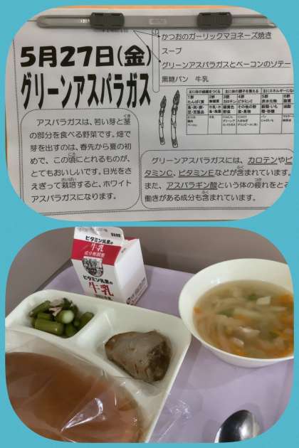 今日のメニューには、1年に1度の「かつおのガーリックマヨネーズ焼き」と「グリーンアスパラガスとベーコンのソテー」が登場します。黒糖パンとスープと一緒に美味しくいただきましょう!