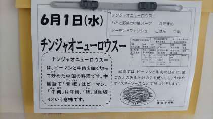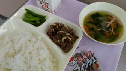 今日のメニューはチンジャオニューロウスー、ハムと野菜の中華スープ、枝豆、アーモンドフィッシュ、ごはん、牛乳です。
