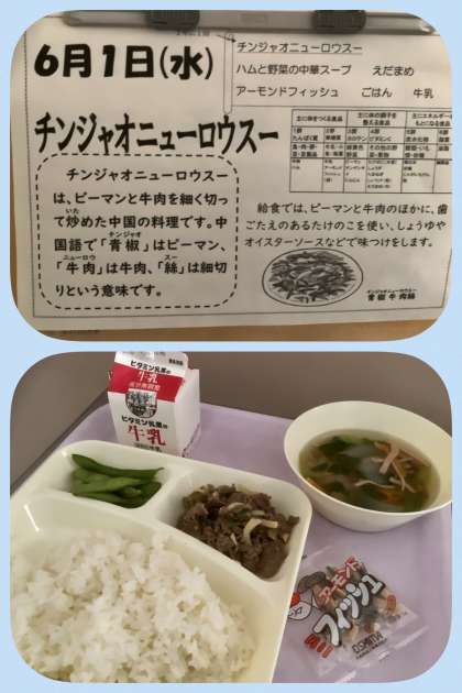 今日のメニューには、1年に1度の「チンジャオ(青椒肉絲)ニューロウスー」が登場します。最近のメニューはとても多彩で、1年に1度のメニューがしばしば登場します。メニューを考えてくださる方々、調理をしてくださる方々、運搬してくださる方々、配膳してくださる方々、当番の皆さん、そして、先生方。給食に関わってくださるすべての方々に感謝の気持ちを持っていただきましょう!