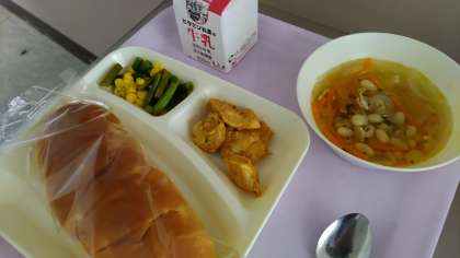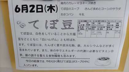きょうの給食は、てぼ豆のスープ、鶏肉のカレーマヨネーズ焼き、さんど豆とコーンのサラダ、おさつパン、牛乳です。