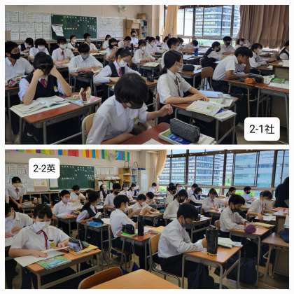 昨日までの雨、曇り空から一転し快晴の暑い日となっています。本日の授業のようすです。換気、水分補給など感染対策を行いながら教育活動を進めています。