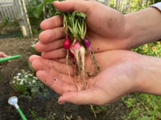 ラディッシュを収穫しました。菜の花の種をとって、また秋植えに使います。マリーゴールドもすくすく成長しています。