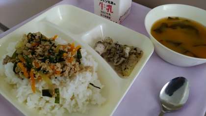 今日の給食は、豚ひき肉とにらのそぼろ丼、みそ汁、キャベツの赤じそ和え、牛乳です。