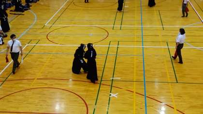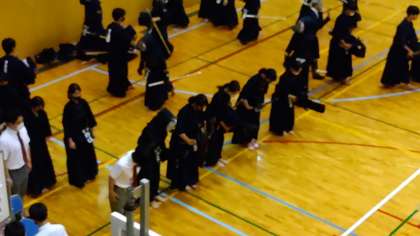女子の部では、初戦※、なかなか足が動かず、自分から前に出る普段の剣道ができなくて苦戦。なんと五人ともが引き分けて、勝負は代表戦に。その代表戦では、大将を任されていた選手が、思い切って面に飛び込み、一本をあげることができ、団体戦を勝利に導きました。